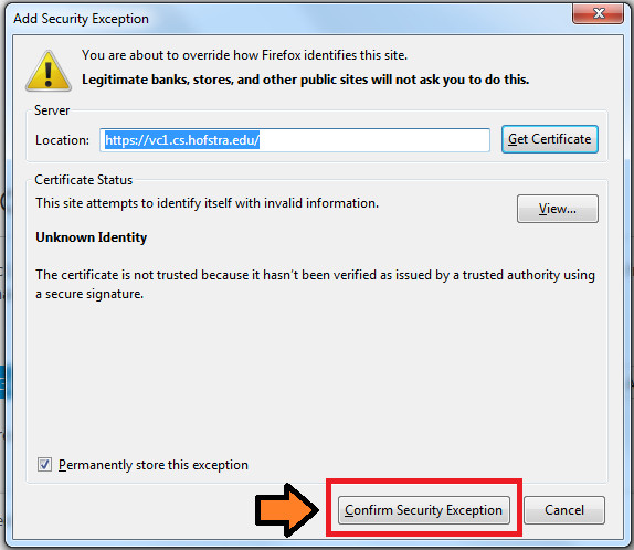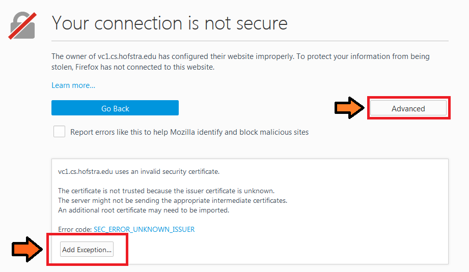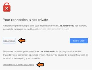 Google Chrome: click “Advanced” and then click “Proceed to vc1.cs.hofstra.edu (unsafe)”