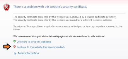 Internet Explorer: click “Continue to the website (not recommended)”