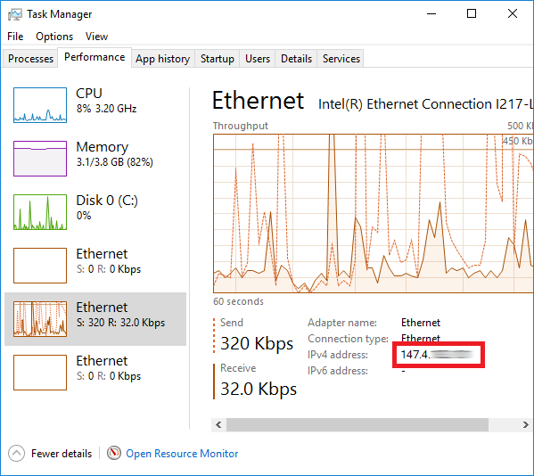 Go to the Performance tab and select Ethernet. Write down the dotted number, aka. IPv4 address.